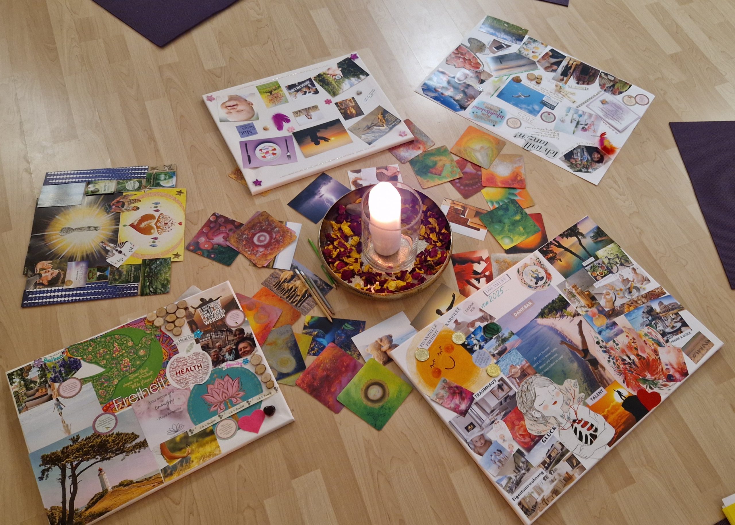 -Eine große (mindestens DinA3) Unterlage (z.B. Leinwand, Fotokarton, Holzplatte etc) worauf Du Deine Visionen visualisieren möchtest.